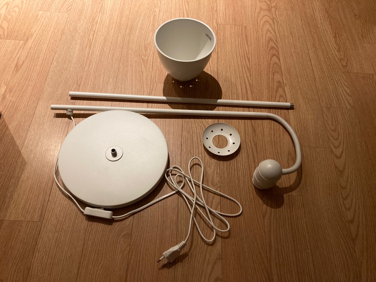 기둥 파이프 2개, 전등갓, 바닥 고정부품 등 많지 않은 구성품으로 이루어져 있습니다.