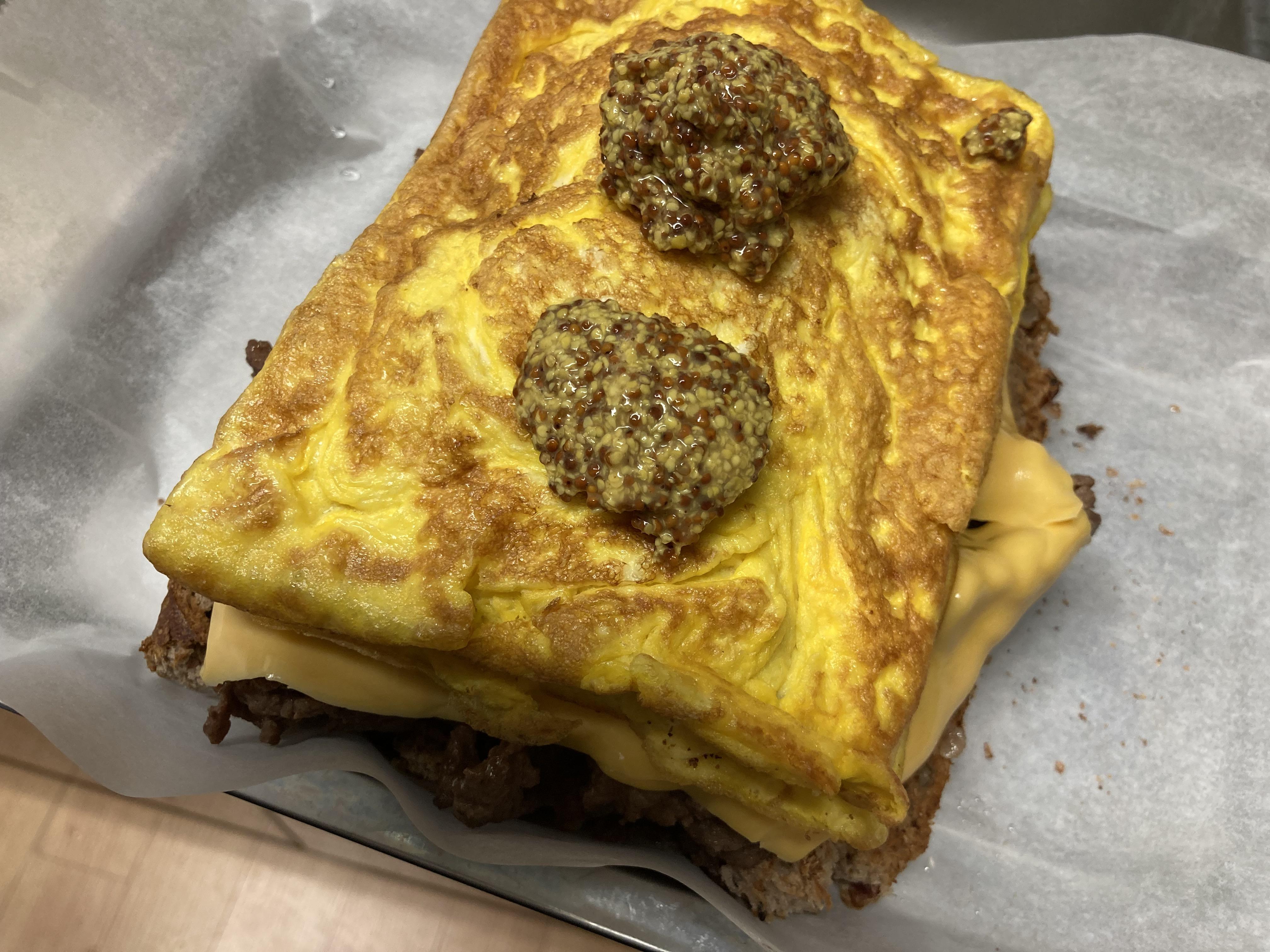 그 위에 빵만하게 구운 계란과 씨겨자를 올려줍니다. 듬뿍듬뿍! 머스터드 많이 올려주면 덜 느끼하고 맛있어지죠!